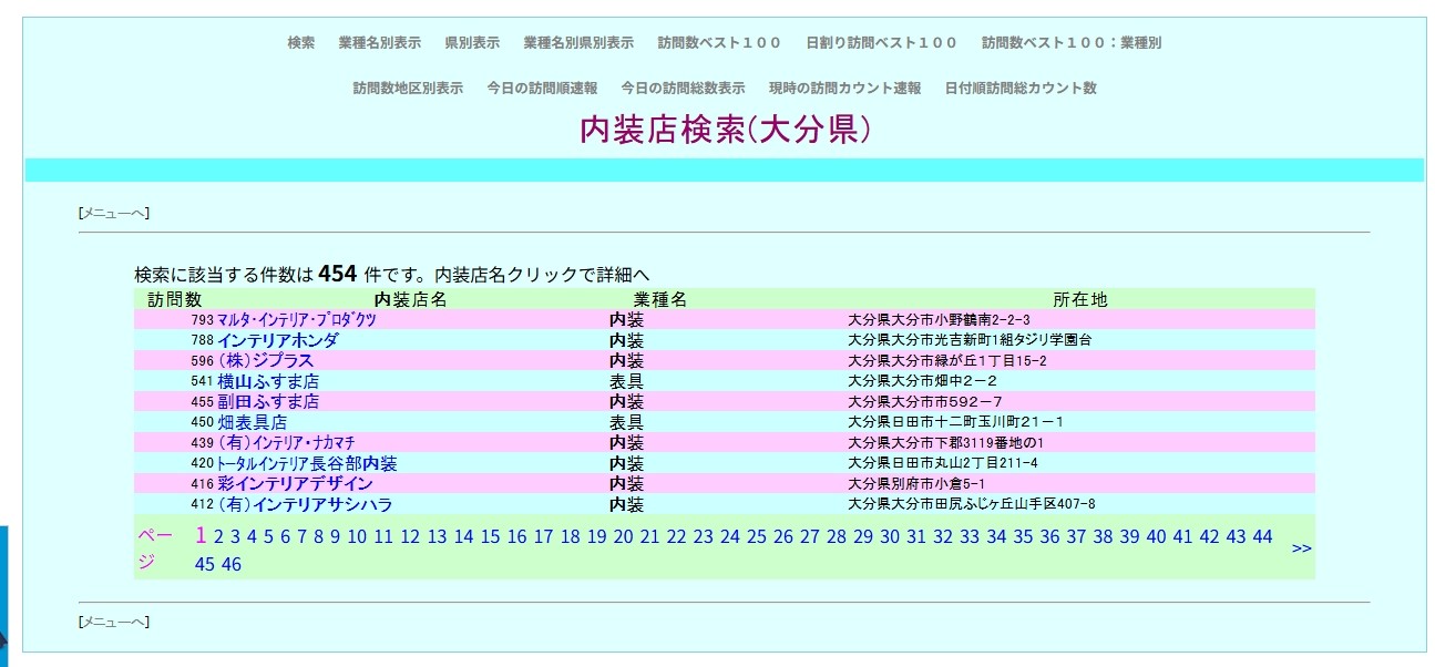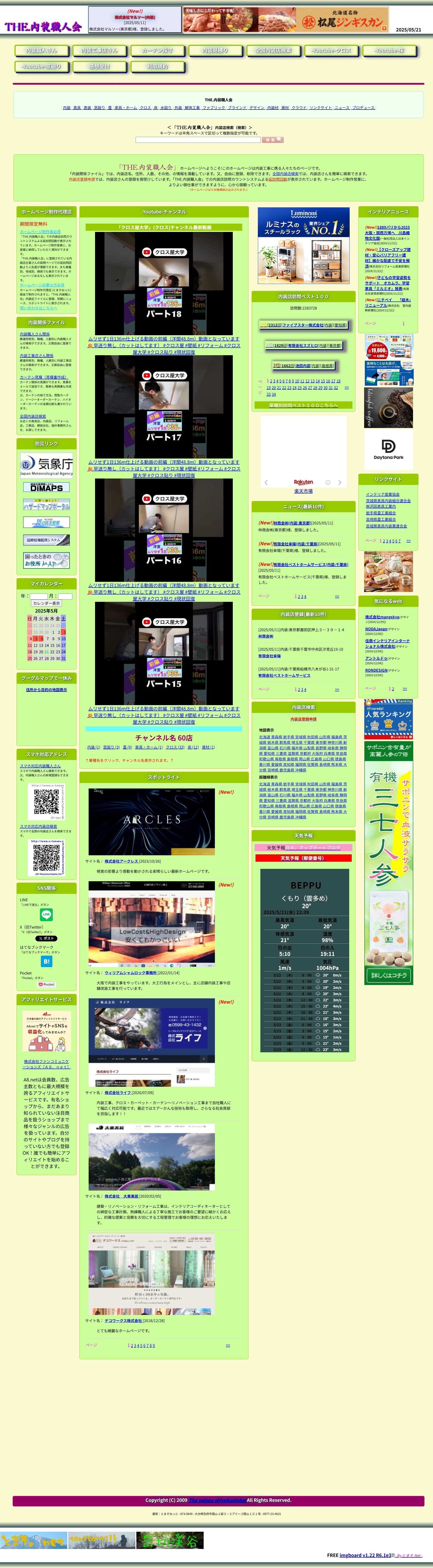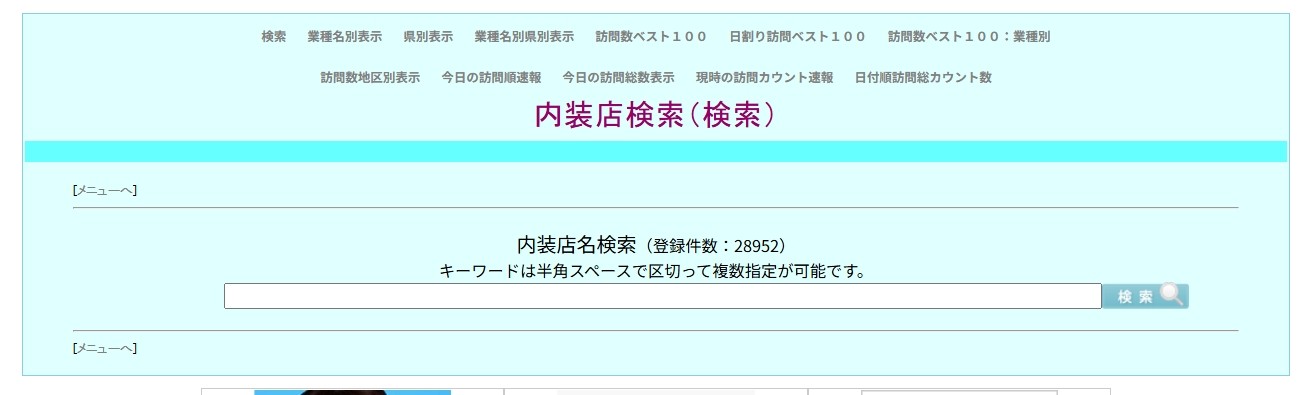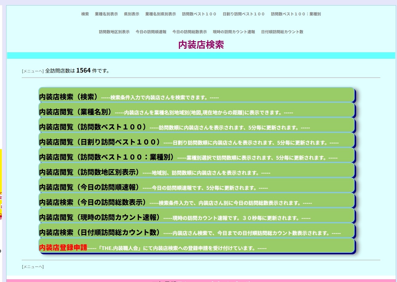 「THE.内装職人会」このホームページは内装工事に携る人々たちのページです。「内装関係ファイル」では、内装店名、住所、人数、その他、の情報を満載しています。又、自由に登録、削除できます。全国内装店検索では、内装店さんを簡単に検索できます。内装店登録申請では、内装店さんの登録を御受けしています。「THE.内装職人会」での内装店訪問カウントシステムよる延訪問回数が表示されています。ホームページ制作営業に、よりよい御仕事ができますように、心から御願っています。